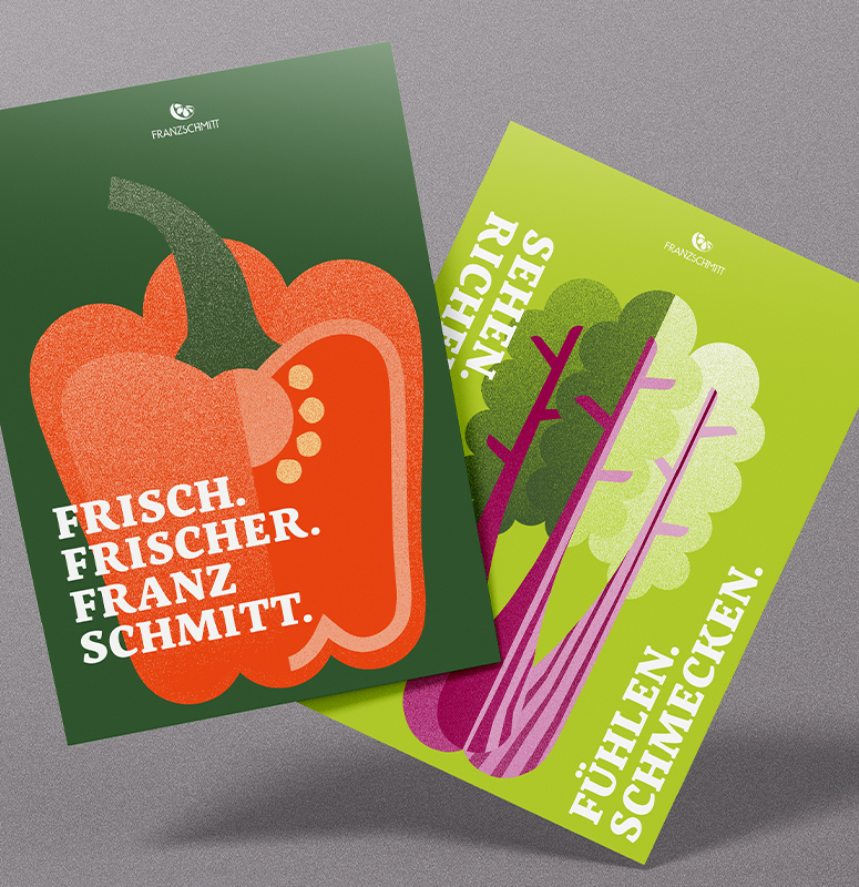 Um Franz Schmitt stärker über Haltung und Gefühl zu positionieren, entwickelten wir einen eigenständigen Illustrationsstil als bewussten Gegenpol zur bildlastigen Gemüsefotografie der Wettbewerber. Der Stil greift einen modernen Retro-Ansatz auf, der sowohl die lange Tradition des Unternehmens als auch seine zeitgemäße Arbeitsweise widerspiegelt. Ergänzt wird dieser Ansatz durch eine ruhige, sachliche Gestaltung mit klaren Flächen und bewusst eingesetzter Zurückhaltung. Markantes Kernelement ist die plakative Typografie: Die Servus Slab in Extra Bold verleiht dem Auftritt Charakter, verweist auf die Münchner Herkunft und erinnert mit einem Augenzwinkern an die Stimme der Marktschreier vergangener Zeiten