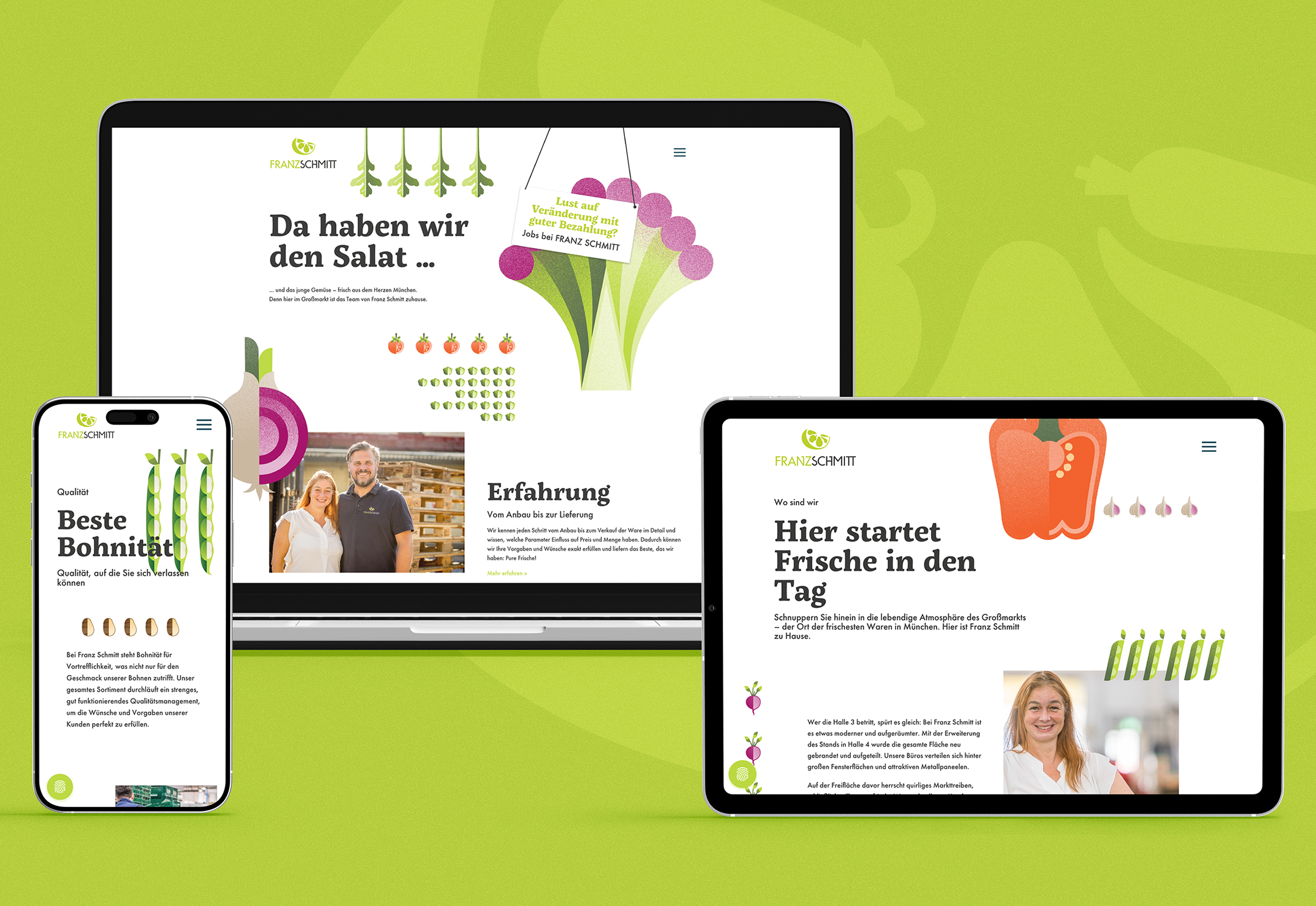 Franz Schmitt, einer der größten Gemüsehändler am Münchner Großmarkt mit langer Tradition, beauftragte uns mit der Modernisierung des Corporate Designs und der Website. Das bestehende Logo und die Logoschrift sollten erhalten bleiben. Ziel war es, den Auftritt insgesamt frischer und menschlicher zu gestalten und sich klar von der stark technisch geprägten Konkurrenz abzuheben. Auch im reinen B2B-Umfeld sollte die Marke emotionaler wirken und Nähe schaffen.